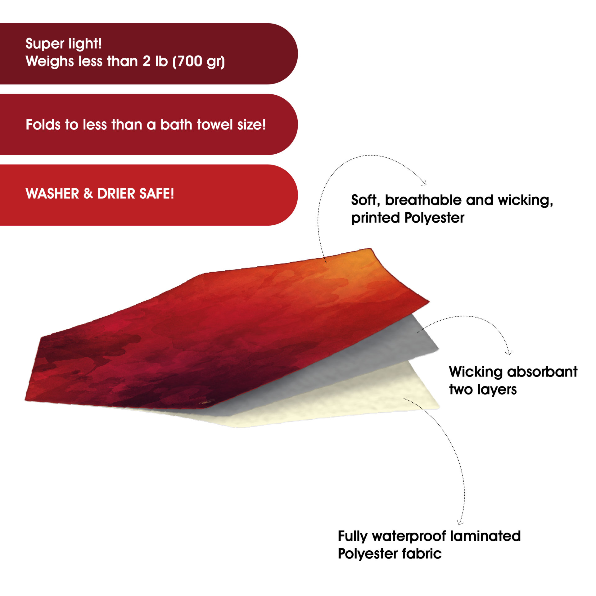 Vibrant sublimated print of flaming reds, the color of passion, action, energy and determination.